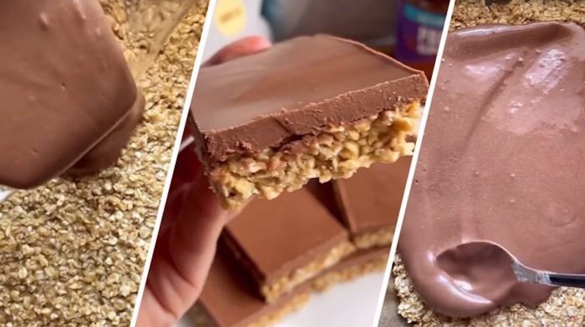 - Sleva upp chokladproteinblandningen på toppen av havregrynen och ställ in formen ni kylen i två till tre timmar.