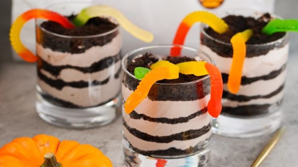 - Nu är det dags att sätta ihop. Alternera lagren med kaksmulorna och yoghurtblandningen i ett runt dricksglas. Se till att det sista lagret är med kaksmulor eftersom det är "jorden" för maskarna.