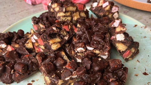 1. Smält först chokladen genom att värma den i 30 sekunders intervaller i mikron och rör runt. Tillsätt ruby chocolate proteinpulvret och rosa livsmedelsfärg om du använder den. Blanda tills det är klumpfritt.